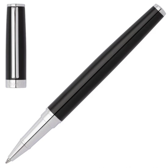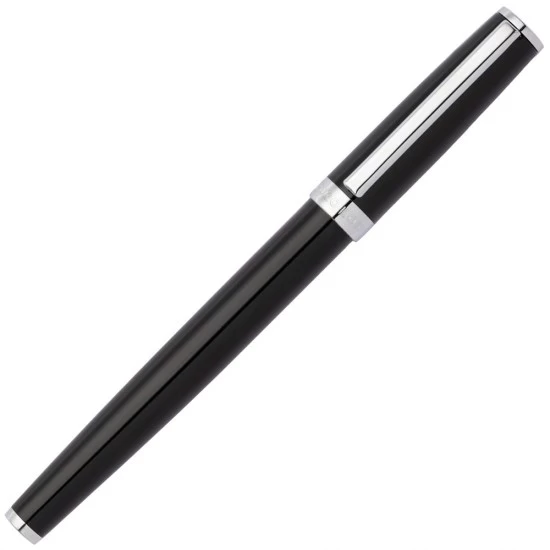 A BOSS Gear Icon pen made from brass. This pen also has a black metallic shiny paint & chrome plated finish & has a measurement of 12mm in diameter & 138mm in height.