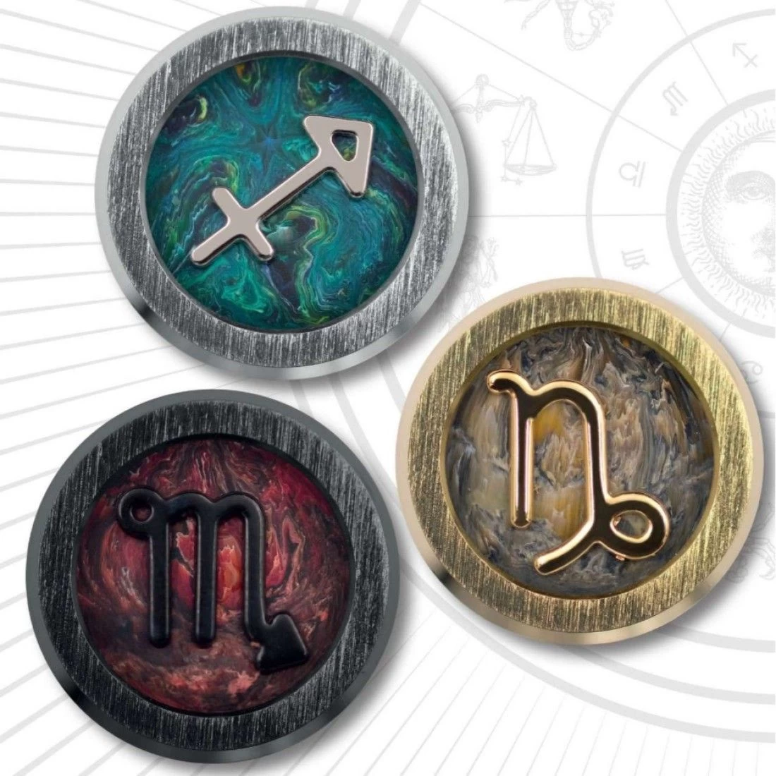 The elegant simplicity of ZERO provides an ideal canvas for astrological exploration. Sinuous resin textures are framed by bold steel hardware punctuated with sapphire crystal: a window onto a zodiac symbol cast in solid metal.